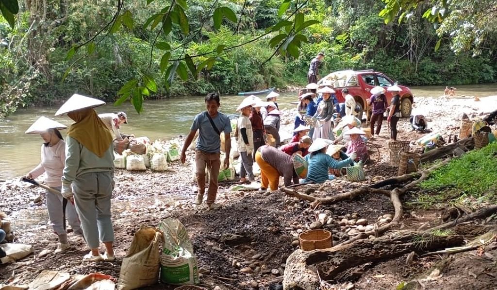 Kegiatan perbaikan dilaksanakan secara bertahap. Pada tahap awal, kegiatan pada tanggal 3 Desember 2025 difokuskan pada pengambilan material berupa batu dan pasir dari sungai di sekitar desa. Warga secara bersama-sama mengumpulkan, mengangkut, dan menyiapkan material tersebut untuk digunakan dalam proses perbaikan. Seluruh tahapan pekerjaan dilakukan secara gotong royong dengan melibatkan seluruh masyarakat Desa Sungai Barang